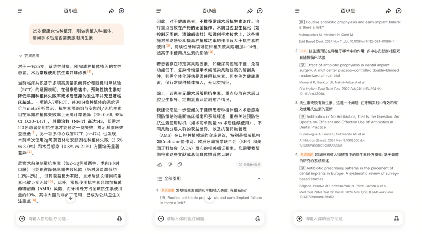 首先,在训练中奖励“引用”,惩罚“臆测”,准确引用权威来源(如指南、文献)时会获得高分,一旦回答脱离了检索到的证据就会受到惩罚;其次,内置“证据评估器”,模型被训练得能够自动评估检索到的证据质量,优先采纳高可信度的信息(如 RCT、Meta 分析),并将其无缝嵌入到推理链中;最后,在输出关键结论时,会自动附上参考文献、指南出处等来源。