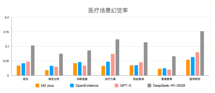 百川智能表示,这种“循证驱动”的生成逻辑,让 M2 Plus 几乎杜绝了无中生有的内容。在多场景评测中,其综合幻觉率在所有大模型当中最低,相较 DeepSeek R1 最新版降低 3 倍,显著领先 OpenEvidence。不仅如此,在病史分析、诊断思路、治疗方案等真实复杂的核心医疗场景中,达到了与人类资深临床专家同等的可信度。