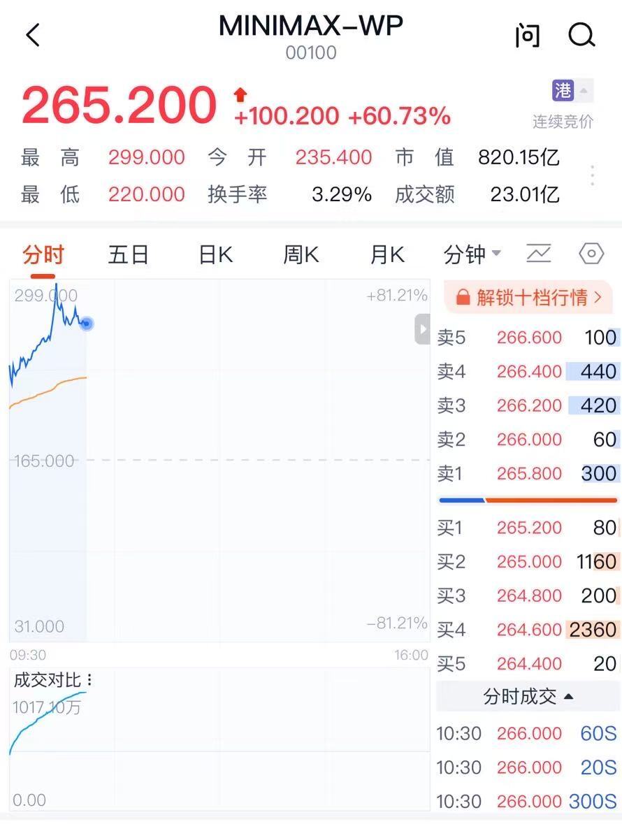 在这次 IPO 中,Mini Max 计划发行约 2540 万股 H 股,开盘价 235.4 港元,截至上午 10:30,股价已飙升超 60%,市值超 820 亿港元(约合人民币 738 亿元)。