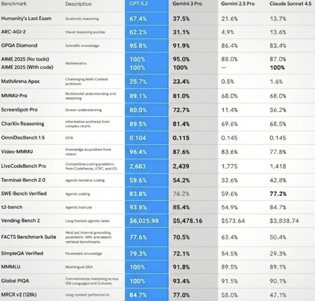 但激烈的大模型争夺战仍在继续。据报道,OpenAI 正计划通过即将推出的 GPT-5.2,对谷歌 Gemini 3 作出首次回应。原计划于 12 月底发布的 GPT-5.2 预计将提前至 12 月 9 日发布。GPT-5.2 的基准测试结果也已经在网上传开。如果这些数据最终被证实,那么这场竞争优势就又回到了 OpenAI 手中。