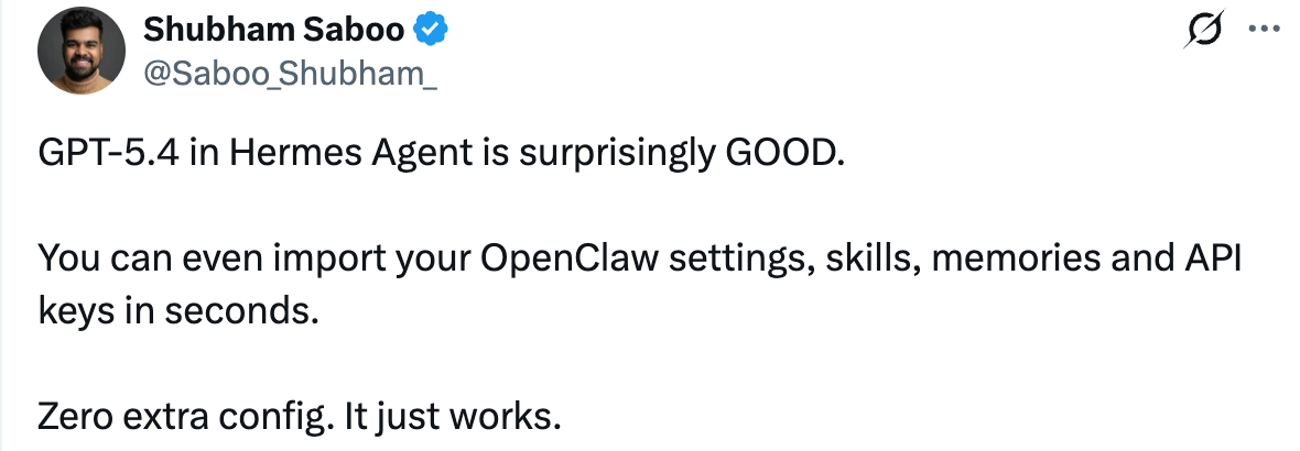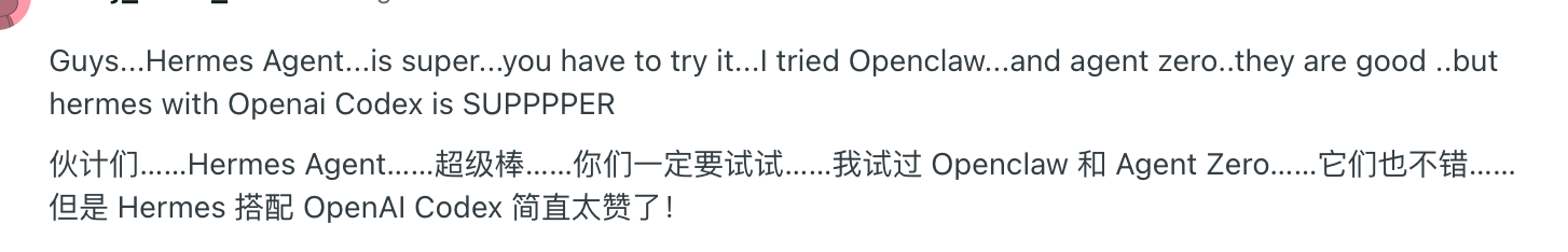 “我试过 OpenClaw、Nanobot、Nanoclaw 等等,但 Hermes Agent 是我最喜欢的。它把我真正关心的功能都做进去了,同时又没有那些臃肿累赘的东西。”有用户表示。