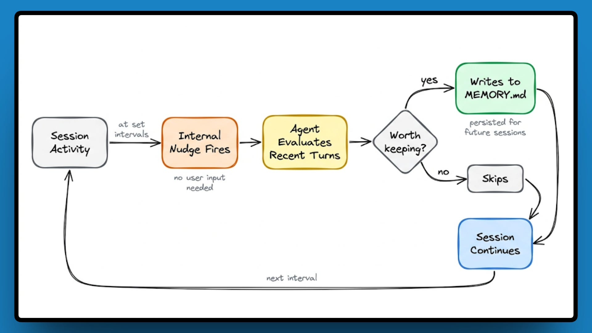 在会话过程中,系统会定期向 Agent 发送一个内部系统级提示(system-level prompt),让它回头看刚刚发生了什么,并判断哪些内容值得写进记忆文件。这个过程不依赖用户输入,而是系统自动触发。这种设计让记忆始终保持“经过整理”的状态,而非沦为每次交互的“垃圾场”,确保记忆的实用性。