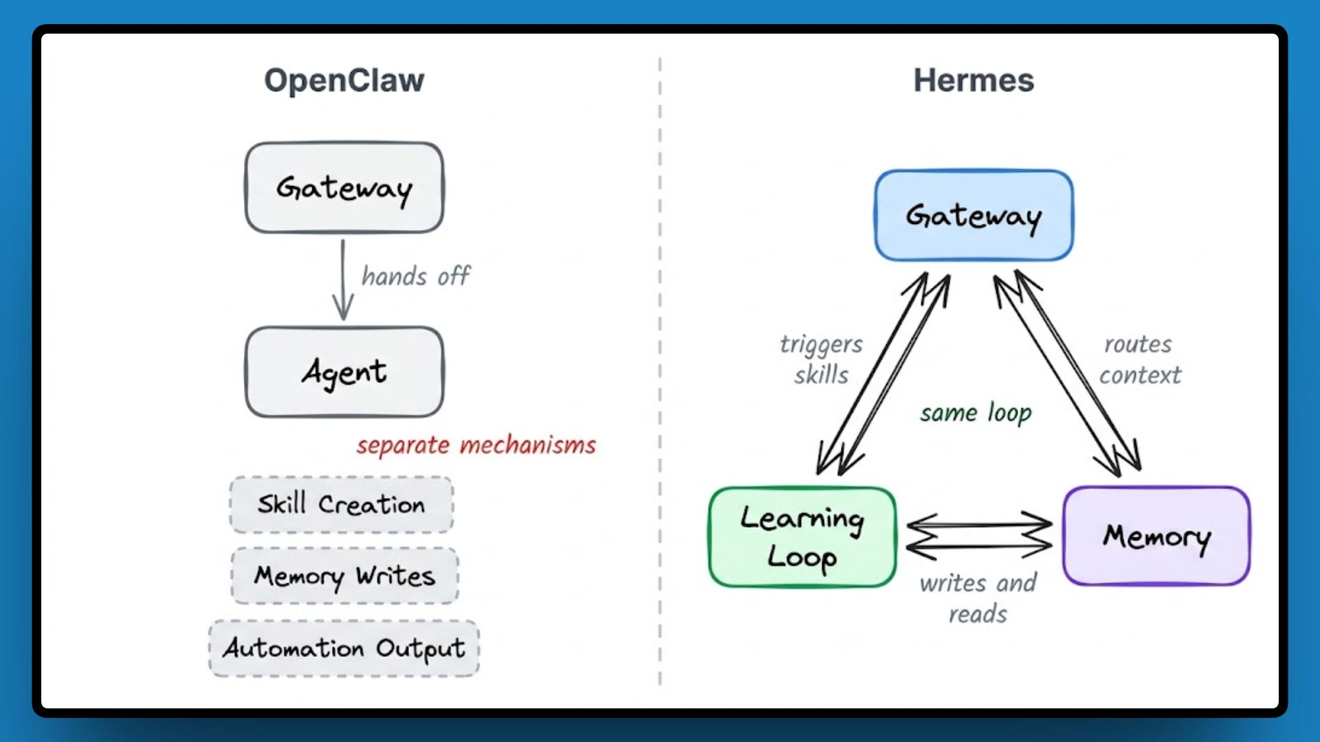 他强调,OpenClaw 提供的是模块化和多 Agent 协同能力,而 Hermes 提供的是一个能随时间积累上下文、沉淀工作流程的单 Agent。
