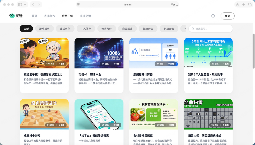 在灵珠前期的种子用户试用阶段,很多用户借助灵珠生成了专属应用,展现出丰富多样的个性化需求:有职场人士制作了年会抽奖系统,有家长创建了专属的孩子成长记录,有用户开发了亲戚称呼计算器,还有用户为自己量身定制了名为“拉了么"的肠道管理小助手……这些案例呈现出一个共同特征——它们都源自日常生活中细微、个性化、小众的需求,这是当下各类 APP 无法满足的“长尾地带"。对创作者来说,灵珠是把创意落地的工具,同时灵珠网页的“应用广场”也是发布平台,就像是“剪映”+“抖音”,从创作到发布、分享、交流,一气呵成。