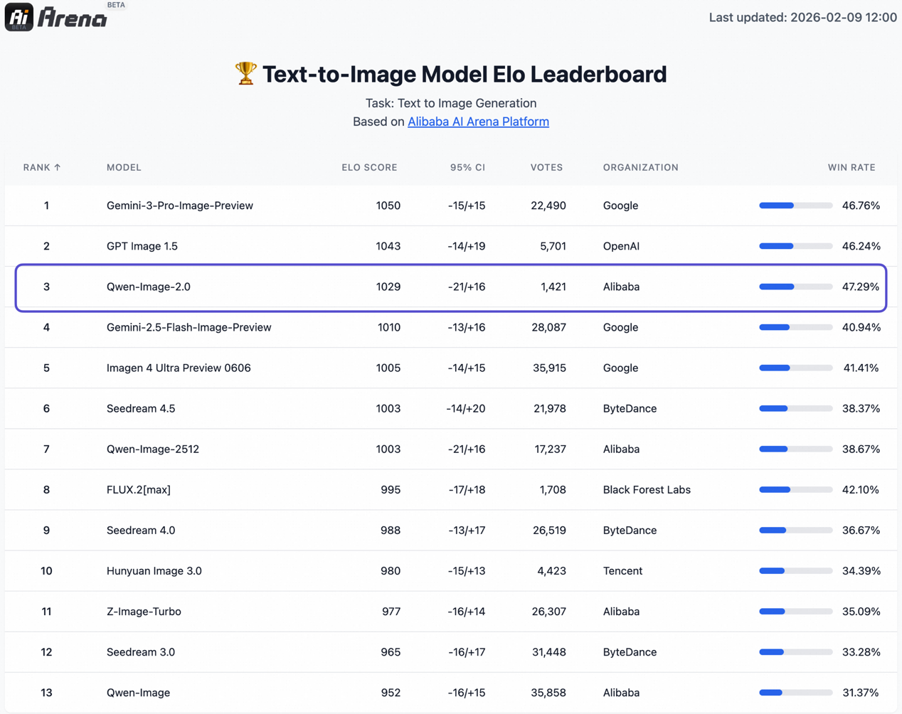 AI Arena 文生图评测中,Qwen-Image-2.0 位居第三