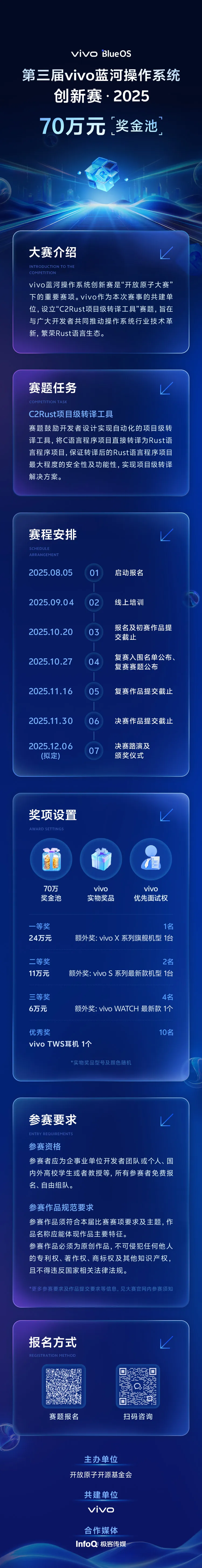 作为大赛的一个重要赛项,vivo 蓝河操作系统创新赛(以下简称“蓝河创新赛”)于 8 月 5 日开启招募。本届大赛基于蓝河操作系统的 Rust 重点技术方向,围绕 C 语言与 Rust 语言的项目级转译设置赛题,资金池高达 70 万元。vivo 致力于把蓝河操作系统创新赛打造为行业内最具含金量和影响力的 Rust 赛事,为 Rust 生态的建设与人才培养搭建高质量交流平台。