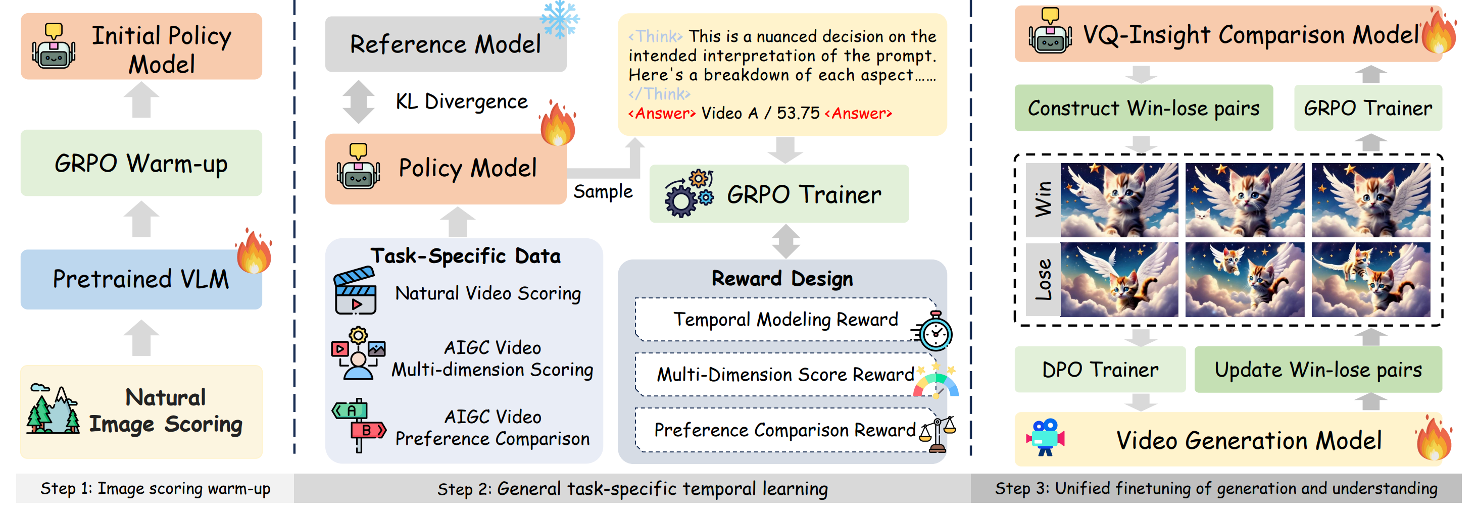图像只捕捉视频的一个切片,用户真实的视频观看体验还取决于时间维度:运动是否自然?色彩是否在动态中稳定?因此,我们把 Q-Insight 的“推理式 + 强化学习”思路,拓展到自然视频和 AIGC 视频的评估和偏好比较中,提出了 VQ-Insight。