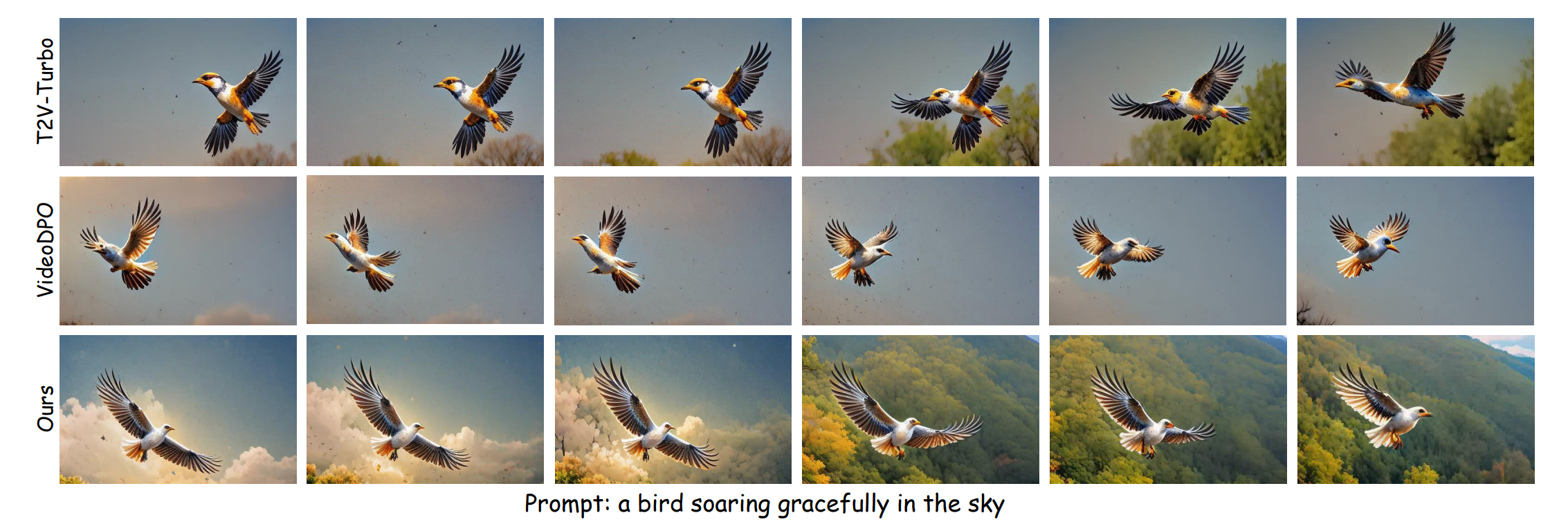 VQ-Insight 强大的 AIGC 视频偏好比较能力,可直接应用于视频生成模型的直接偏好优化(DPO)。如图所示,基于 VQ-Insight 的方案相比于生成模型基线和对比方法,有效地缓解了错误生成的问题,并有着更鲜艳的色彩和动态。