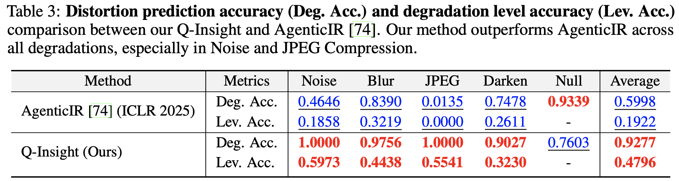 在退化感知任务上,Q-Insight 的表现显著优于现有的退化感知模型,尤其是在噪声(Noise)和 JPEG 压缩退化类型识别的准确性上;
