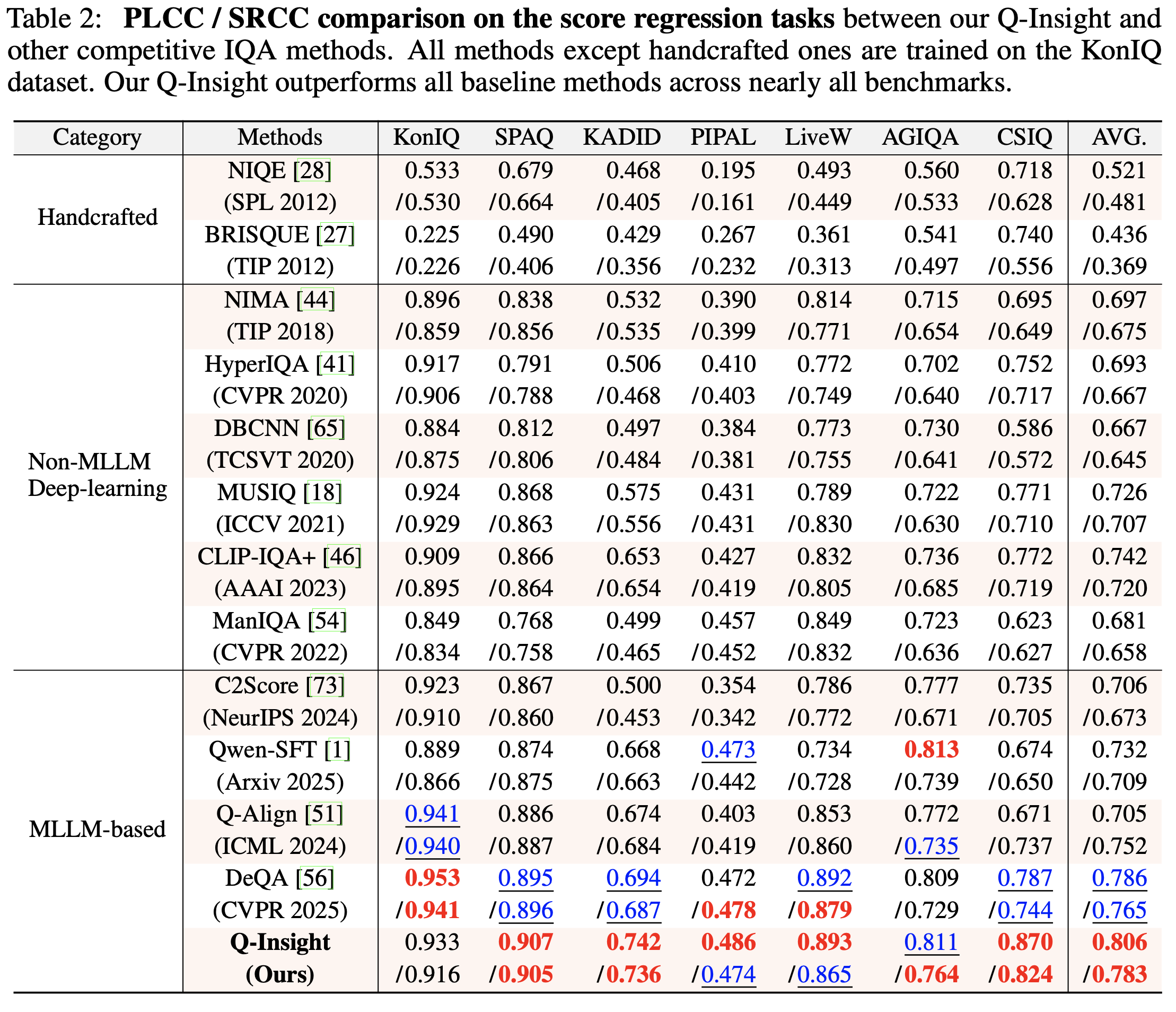 在图像质量评分任务上,Q-Insight 在多个公开数据集上的表现均超过当前最先进的方法,特别是在域外数据上的泛化能力突出,并能够提供完整详细的推理过程;