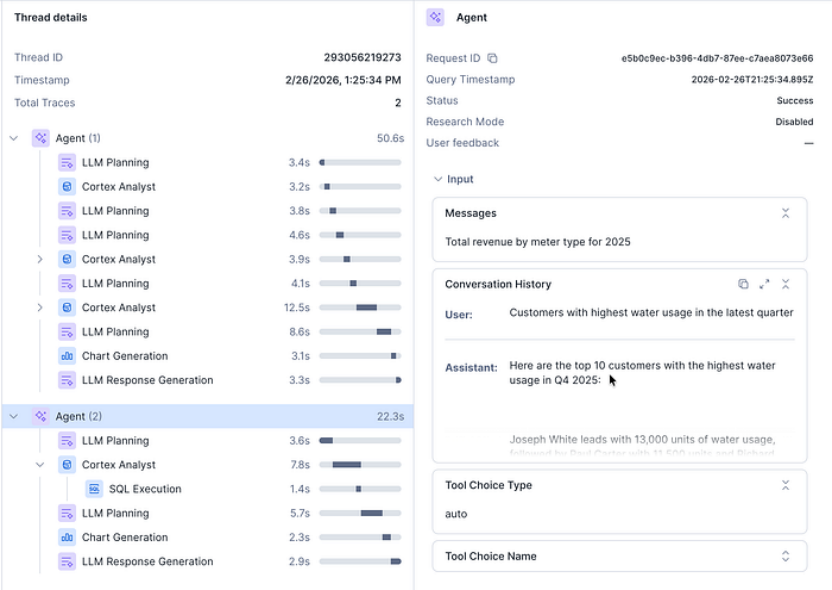 对于每个 Cortex 智能体,Snowsight 中的用户界面都会提供一个监控面板,Snowflake 会在此处展示按线程分组的对话历史记录。对于每个线程,您都可以看到一个跨度追踪树,其中显示了 LLM 规划、工具执行(Cortex Search、Cortex Analyst、网络搜索)、SQL 执行与图表生成,以及最终响应的生成过程。