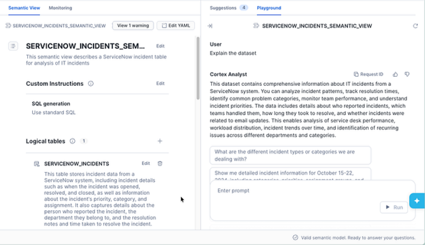 从智能体获取答案的准确性,在很大程度上取决于底层数据的准备质量。在我们与客户的合作过程中,测试阶段几乎总会暴露出数据质量或建模方面的问题。这完全在意料之中!随着数据被正式投入使用,其质量和结构会不断改进。您此刻在数据准备上投入的时间,日后将带来丰厚回报——它能大幅减少在语义视图层面进行修复、采用权宜之计或添加自定义指令的需求,从而避免视图变得更加难以维护。