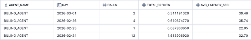 SELECT  AGENT_NAME,  DATE_TRUNC('day', START_TIME)::DATE AS DAY,  COUNT(*) AS CALLS,  SUM(TOKEN_CREDITS) AS TOTAL_CREDITS,  ROUND(AVG(TIMESTAMPDIFF('millisecond', START_TIME, END_TIME)) / 1000, 2) AS AVG_LATENCY_SECFROM (  SELECT AGENT_NAME, START_TIME, END_TIME, TOKEN_CREDITS  FROM SNOWFLAKE.ACCOUNT_USAGE.CORTEX_AGENT_USAGE_HISTORY  UNION ALL  SELECT AGENT_NAME, START_TIME, END_TIME, TOKEN_CREDITS  FROM SNOWFLAKE.ACCOUNT_USAGE.SNOWFLAKE_INTELLIGENCE_USAGE_HISTORY)WHERE START_TIME >= DATEADD(day, -7, CURRENT_TIMESTAMP())  AND AGENT_NAME IS NOT NULLGROUP BY 1, 2ORDER BY DAY DESC, TOTAL_CREDITS DESC;