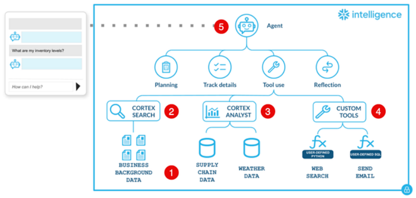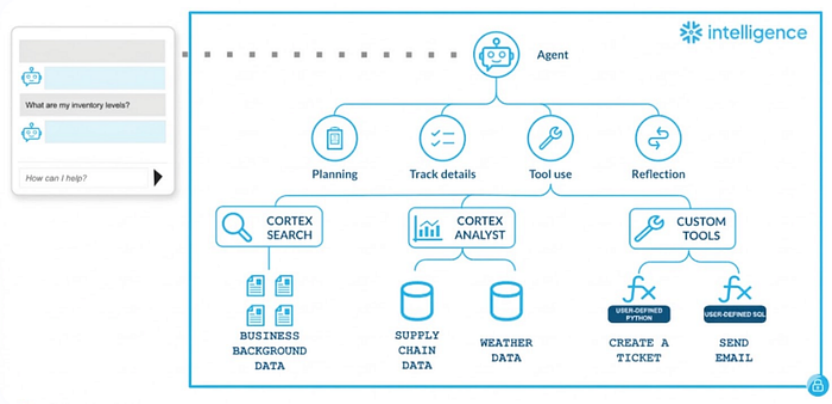 • Cortex 智能体 是编排层,负责分解用户请求,选择合适的工具(Cortex Analyst、Cortex Search、自定义工具),并以自然语言返回结果;
