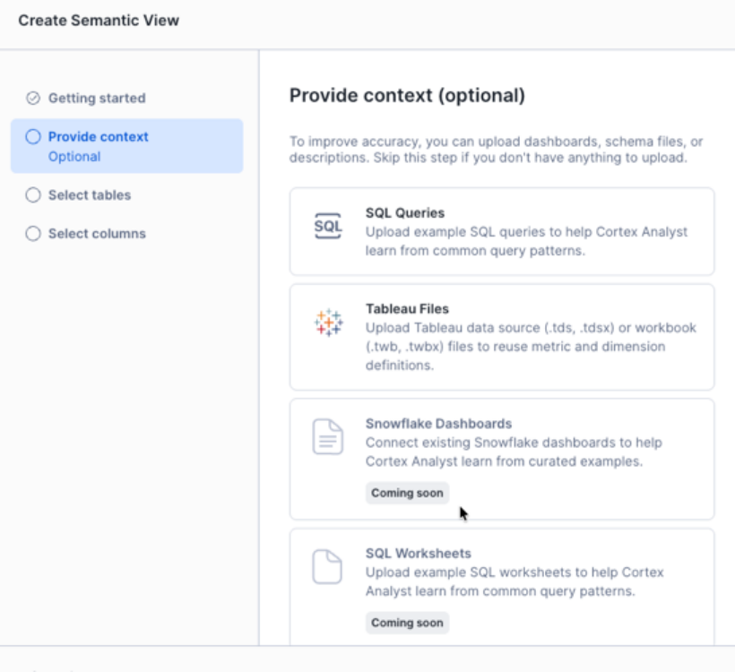 第三步:为 Cortex Analyst 设置语义视图。 这通常是工作量最大的一步,但语义视图自动导航功能可以通过摄取现有元数据(例如 Tableau 工作簿和 SQL 查询,后续还将支持更多数据源)显著提升构建速度;