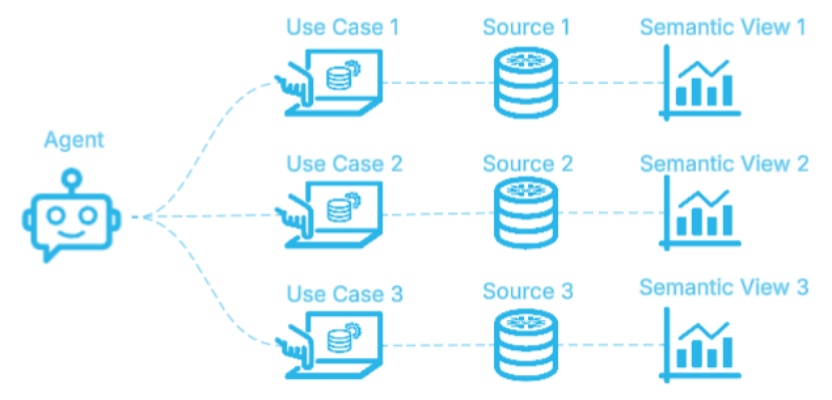 • 从用例入手。此前,您已明确了智能体的能力范围。现在需要识别该范围内的具体用例,并将其与底层数据源对齐。这些用例通常会映射到各自独立的语义视图;