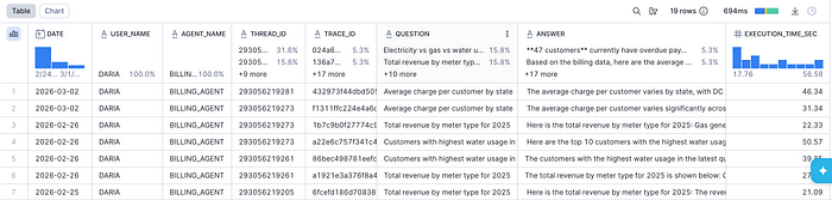 SELECT  DATE(TIMESTAMP) AS DATE,  RESOURCE_ATTRIBUTES['snow.user.name']::STRING AS USER_NAME,  RECORD_ATTRIBUTES['snow.ai.observability.object.name']::STRING AS AGENT_NAME,  RECORD_ATTRIBUTES['snow.ai.observability.agent.thread_id']::STRING AS THREAD_ID,  TRACE['trace_id']::STRING AS TRACE_ID,  RECORD_ATTRIBUTES['ai.observability.record_root.input']::STRING AS QUESTION,  RECORD_ATTRIBUTES['ai.observability.record_root.output']::STRING AS ANSWER,  ROUND(RECORD_ATTRIBUTES['snow.ai.observability.agent.duration']::NUMBER / 1000, 2) AS EXECUTION_TIME_SECFROM SNOWFLAKE.LOCAL.AI_OBSERVABILITY_EVENTSWHERE RECORD_ATTRIBUTES['snow.ai.observability.object.name']::STRING = '<YOUR_AGENT>'  AND RECORD['name']::STRING = 'AgentV2RequestResponseInfo'ORDER BY TIMESTAMP DESC;