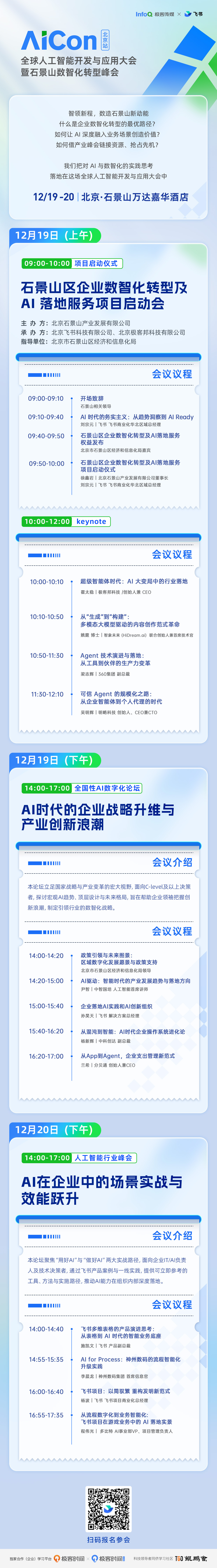 作为石景山区推进产业智能化升级的重要载体,此次 AICon 不仅是一场技术与趋势的交流活动,更致力于打造一个连接政府、企业、技术平台与产业生态的高端对接平台。通过集中释放政策信号、汇聚行业资源、呈现可复制的落地经验,大会希望为企业数智化转型提供更加清晰、可行的行动路径。