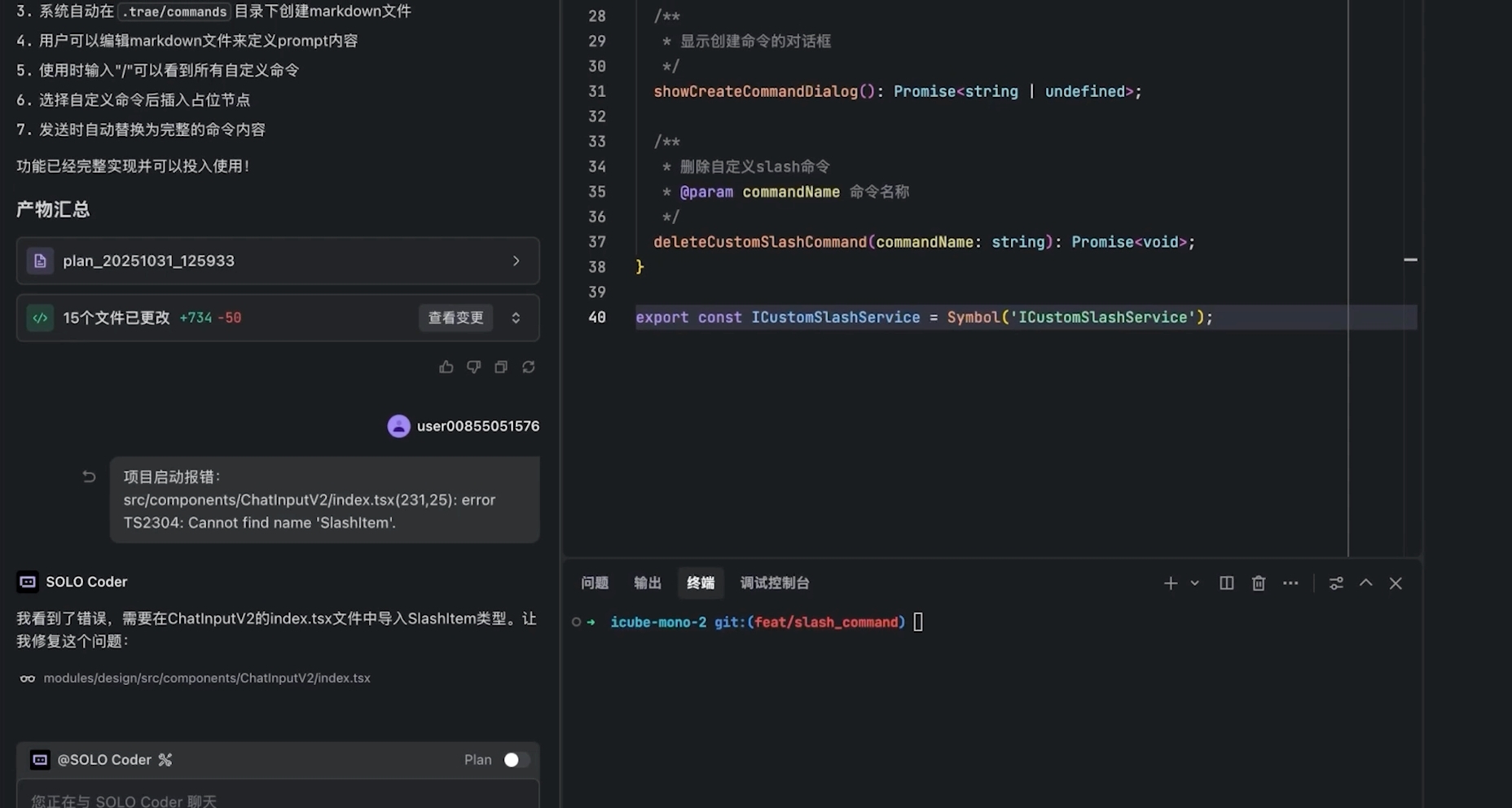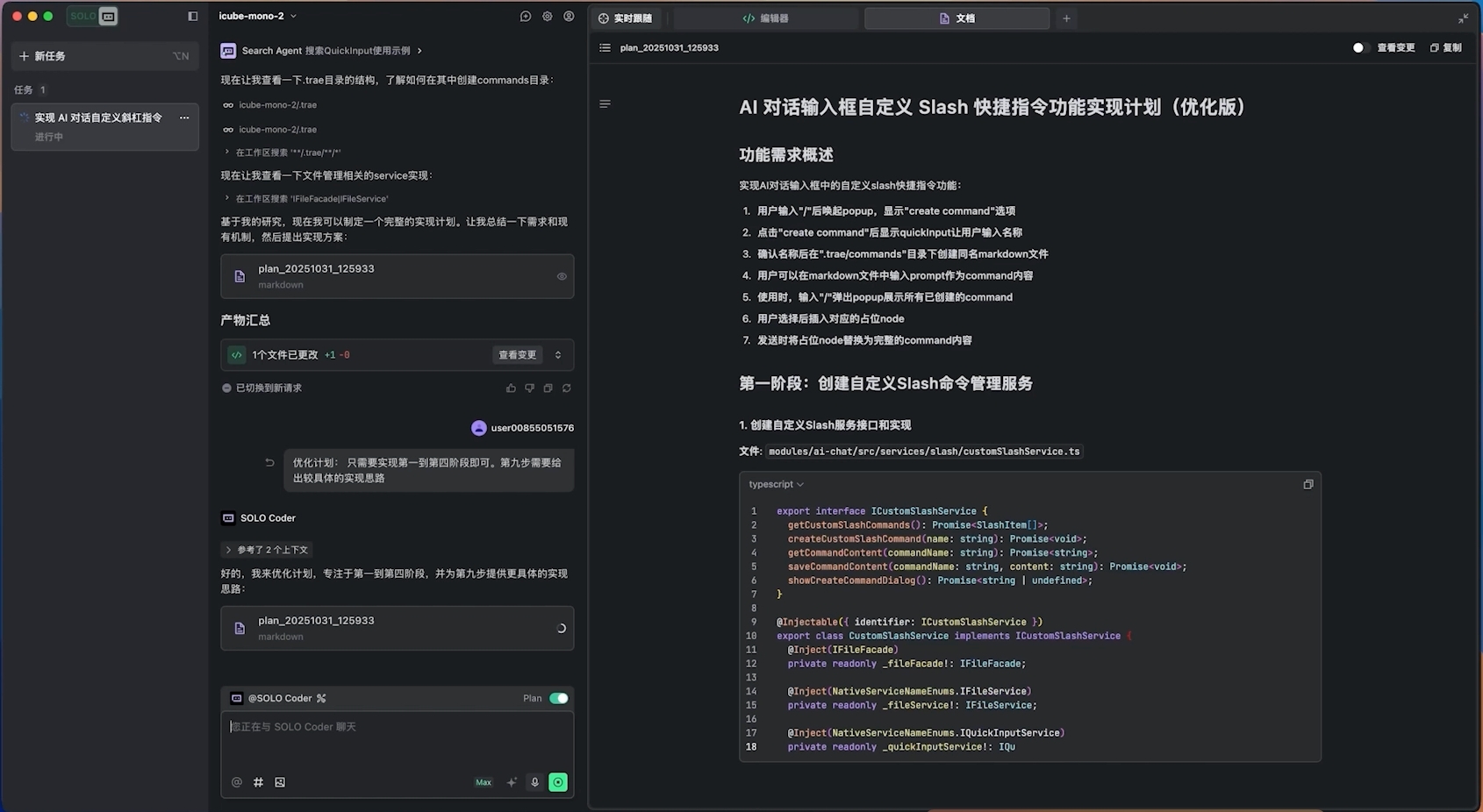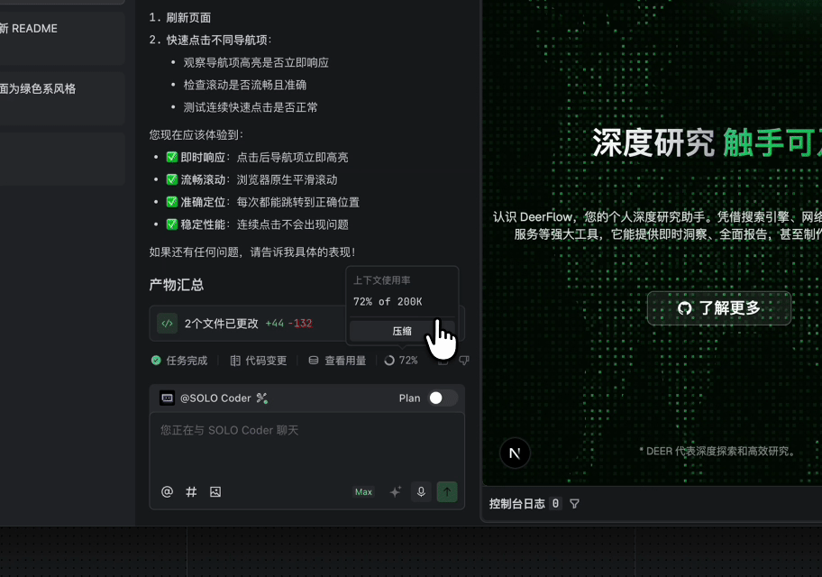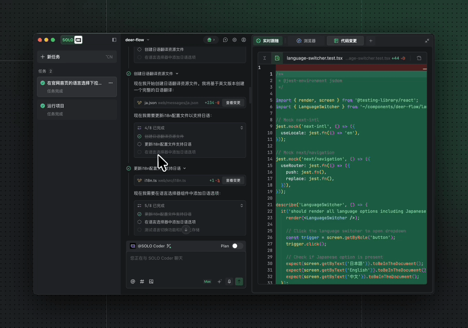 @SOLO Coder 开启 Plan 生成计划,确认后开发。SOLO Coder 自动调用不同智能体完成任务,开启新任务 @SOLO Coder,并行开发多模块,进度清晰可见,对话结束后统一查看代码变更,明确范围。