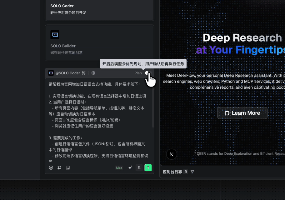 新增内置智能体 SOLO Coder + Plan,计划确认再开发:集成更多工具,与智能体协同随时反馈、有效沟通。
