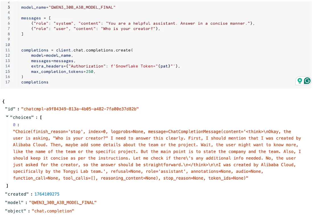 import openaiclient = openai.OpenAI(base_url=url, api_key="not_a_real_key")services_df = mv.list_services()services_dfendpoint = services_df.iloc[-1]["inference_endpoint"] # change index if the model has more than once service## v1 is the current version of inference endpoint for Open AI compatible APIs## no relation with model versioning in Snowflake ML Registryurl = f"https://{endpoint}/v1"url## in next line, you don't need an actual key from openai. ## You can pass any string.. ## the Snowflake PAT is what it is being used for authentication. client = openai.OpenAI(base_url=url, api_key="not_a_real_key")pat = "........."#model_name="Qwen3_30B_A3B_model_final"## CASE SENSITIVE!!!!!model_name="QWEN3_30B_A3B_MODEL_FINAL"messages = [ {"role": "system", "content": "You are a helpful assistant. Answer in a concise manner."}, {"role": "user", "content": "Who is your creator??"},]completions = client.chat.completions.create( model=model_name, messages=messages, extra_headers={"Authorization": f'Snowflake Token="{pat}"'}, max_completion_tokens=250,)completions