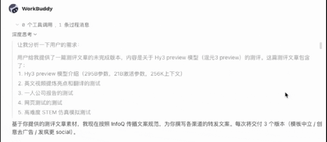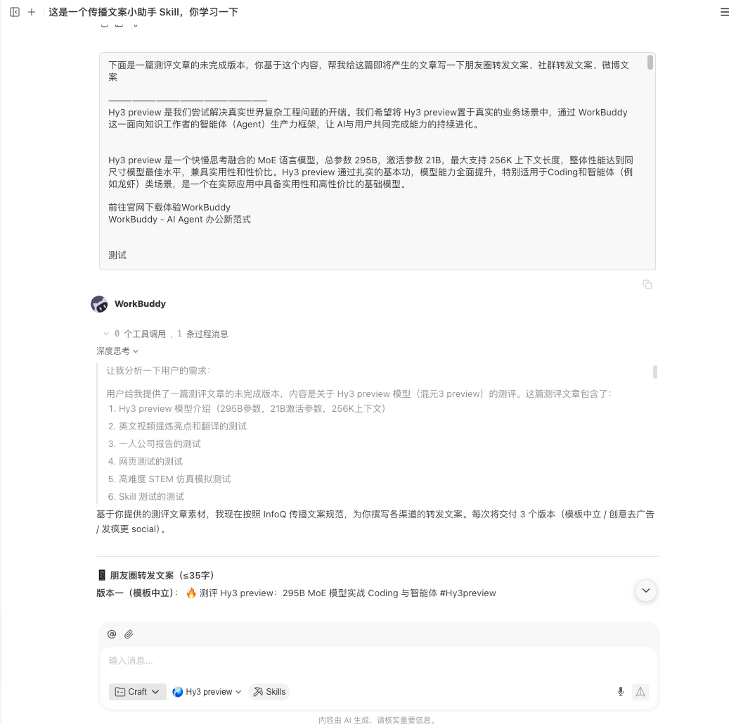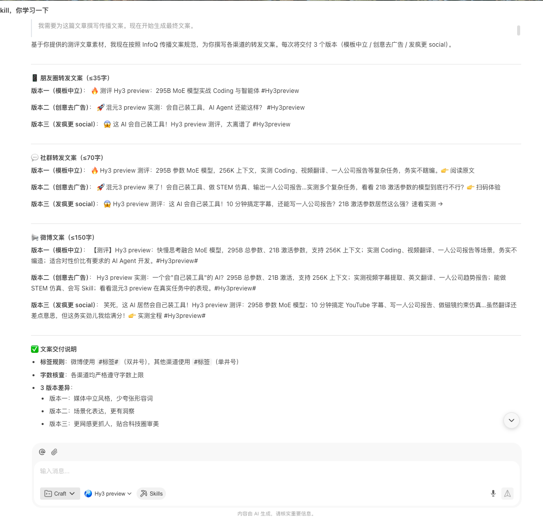 完整思考过程如下,Hy3 Preview 先快速总结了文章的内容和我的诉求,然后抓取文章的核心信息和关键字(甚至包含了传播转化动作与品牌露出),并按照 Skill 的规范去生成文案。生成之后先检查字数、符号使用规范等,最后有重新对照了一下原文内容去确保生成的文案信息准确,验证之后给我交付了结果。