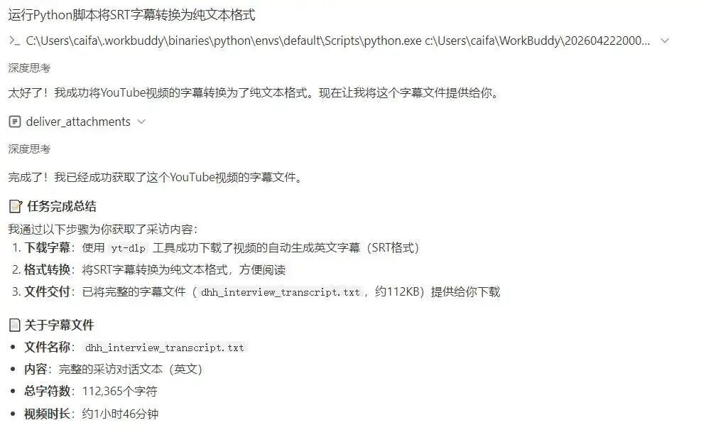 下一步,让 Hy3 preview 提取视频字幕文件。