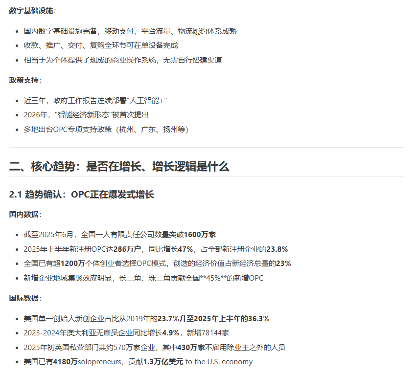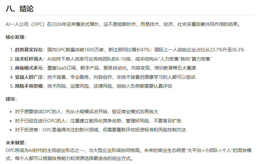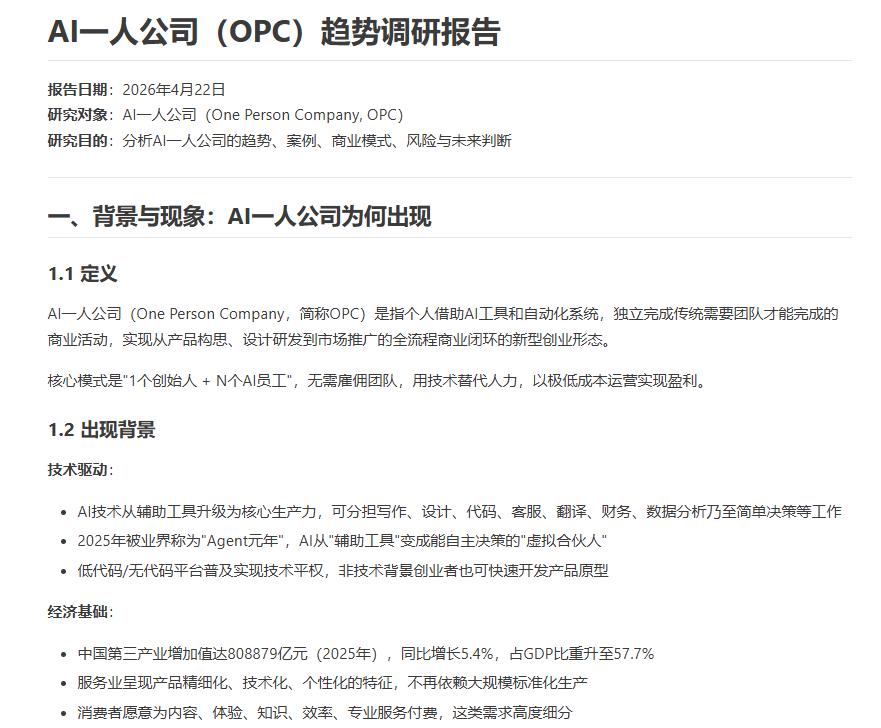 你现在是一个具备真实工作能力的研究型 Agent。你的目标不是基于已有知识生成内容,而是通过主动调用工具,完成一次完整的“AI 一人公司(One Person Company, OPC)趋势调研”,并交付一份结构清晰、信息可靠的研究报告。