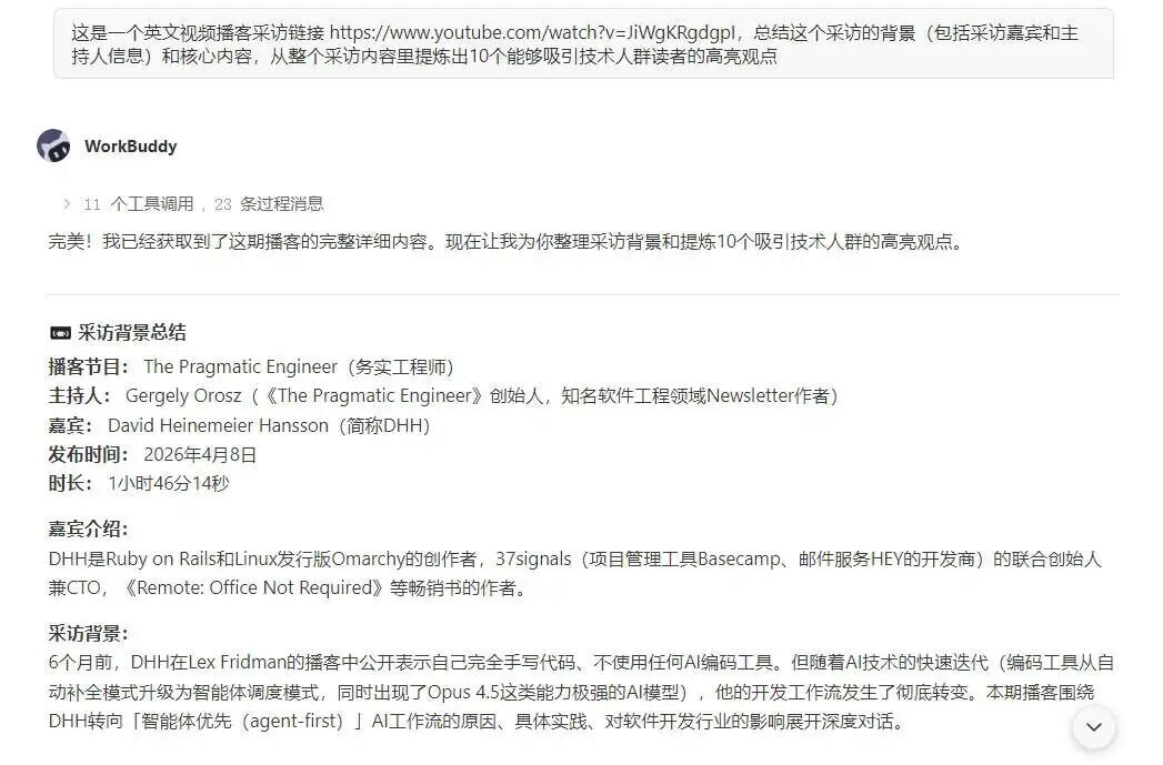 第一个小任务,尝试让 Hy3 preview 给英文采访视频提炼核心内容和亮点。这也是我们的日常工作场景之一。