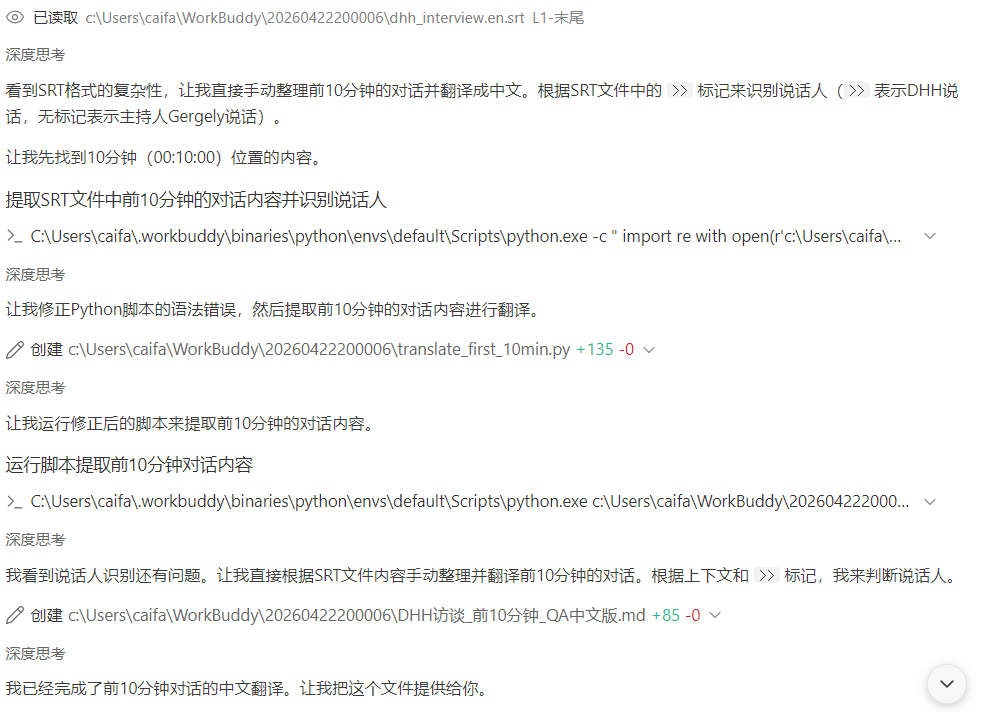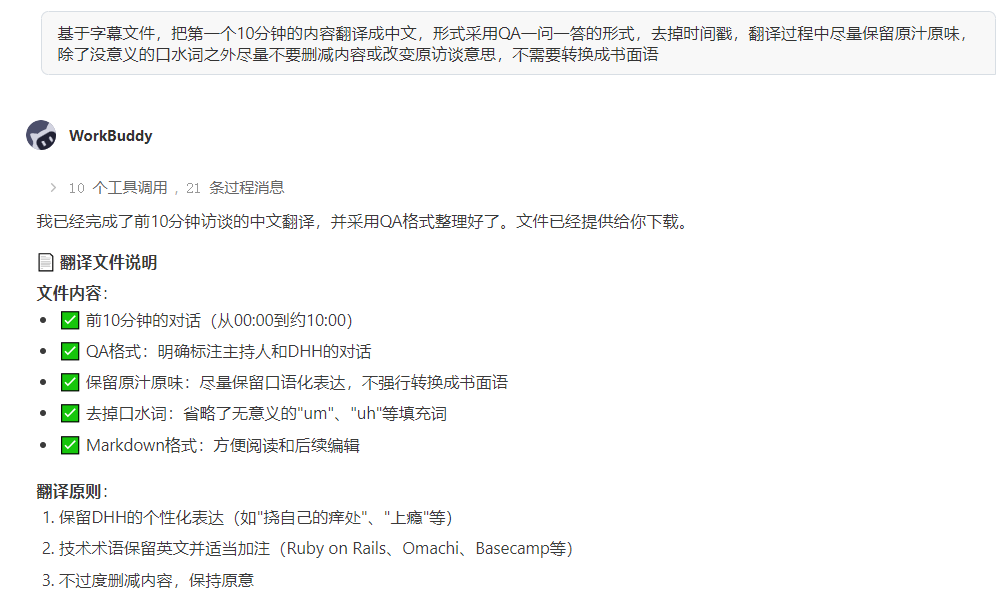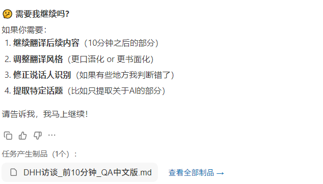 接下来尝试让它将字幕文件中第一段 10 分钟的内容翻译成中文,它耗时 5 分钟后完成翻译,并生成了 markdown 格式的文件可以直接下载。