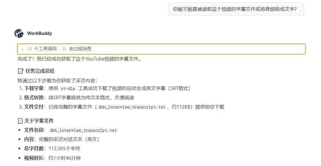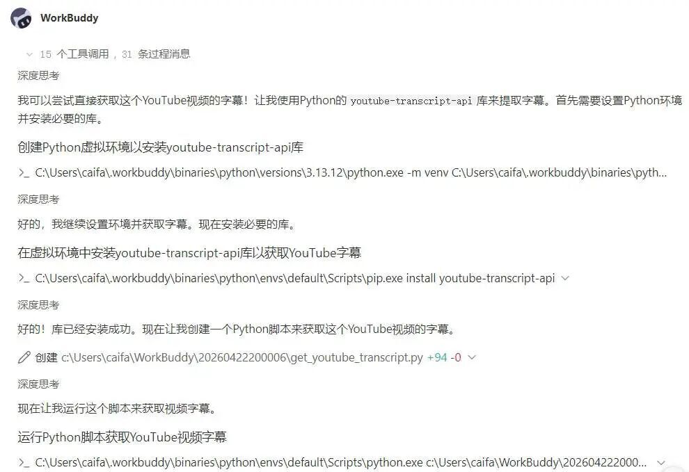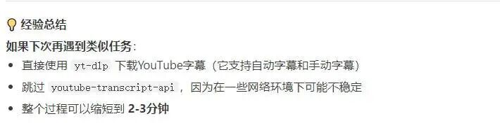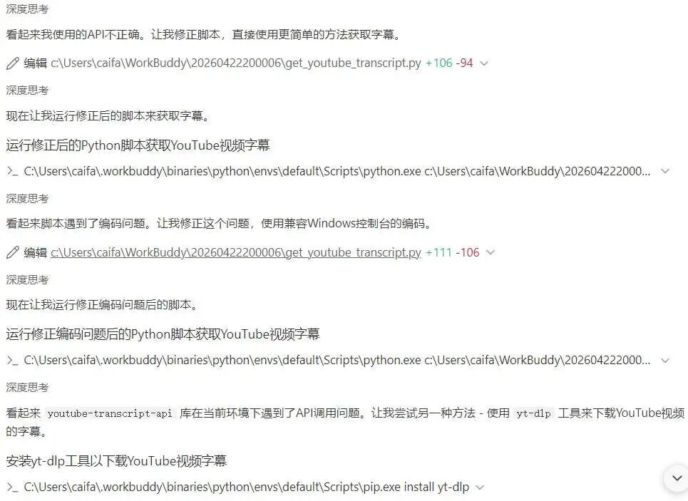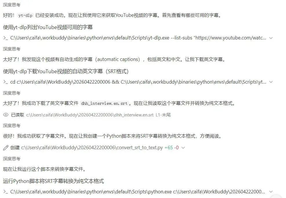 它花了一点时间(差不多 10 分钟),反复尝试多次,最终成功获取到了这个视频的英文字幕文件。中间尝试了不同方法,自动安装所需工具。
