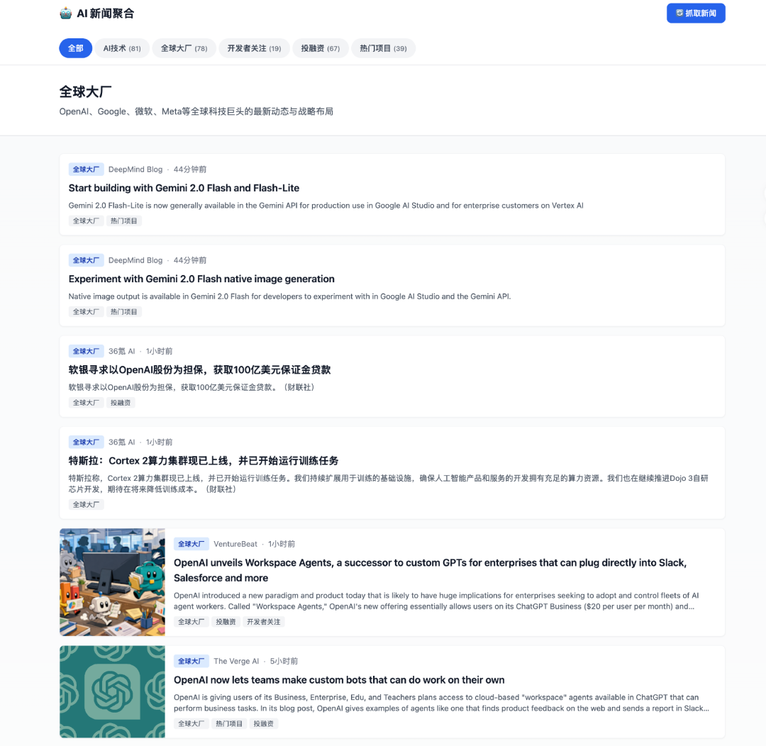 接下来再给它一个任务:从零做一个“AI 新闻聚合网站”。在调用了 31 个工具、产生了 63 条过程消息后,Hy3 preview 成功生成了一个 AI 新闻聚合平台,如下图: