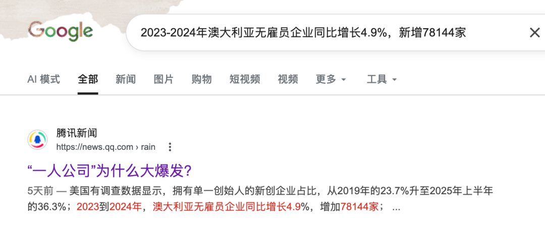 在准确性方面,我们随机抽检了两组数据,第一组数据:“2023-2024 年澳大利亚无雇员企业同比增长 4.9%,新增 78144 家”,在搜索后可以找到出处,数值引用也正确。