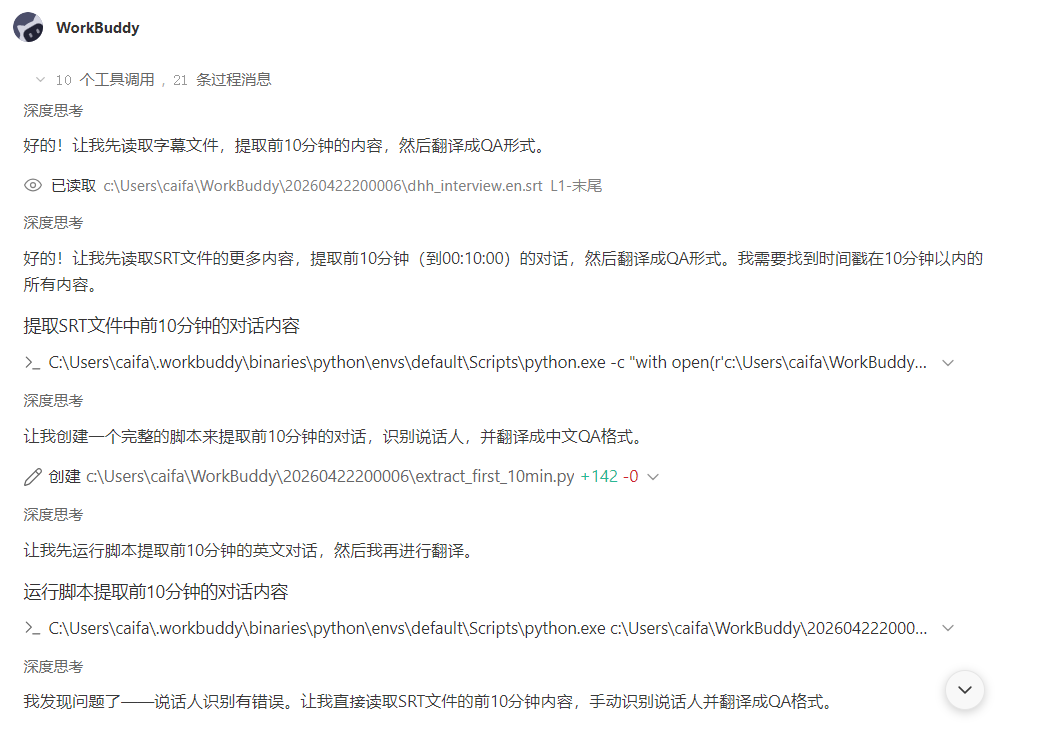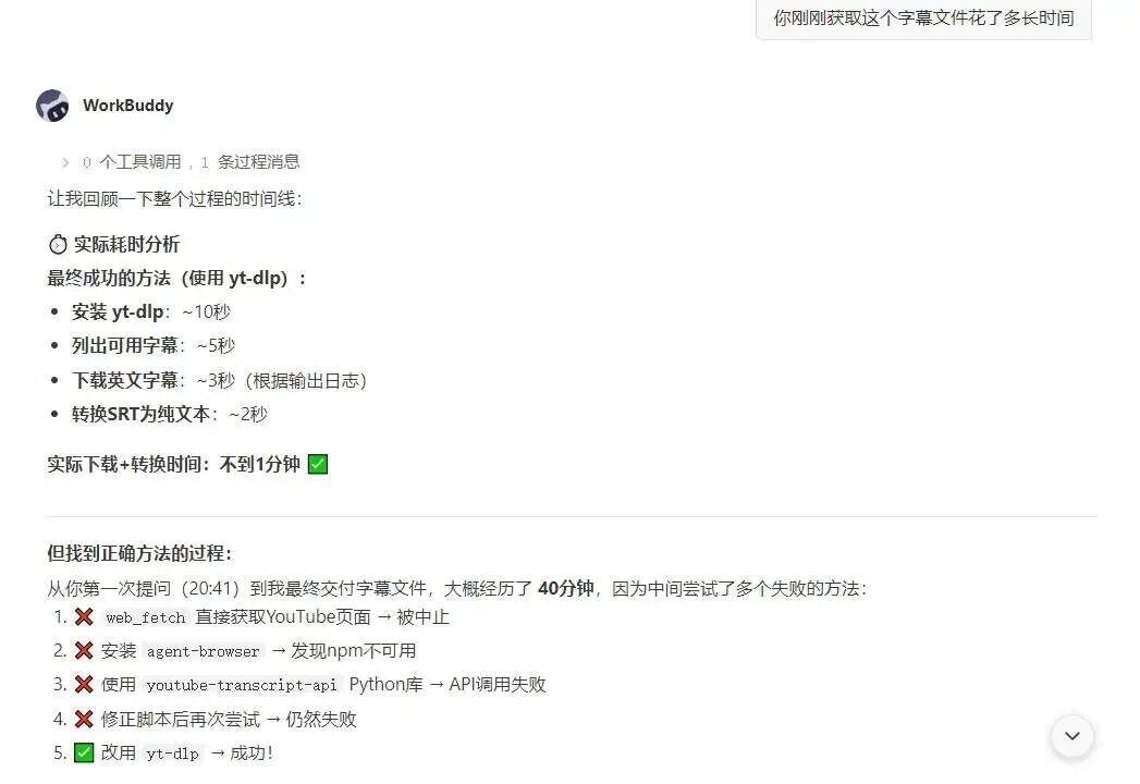 我问它获取字幕文件花了多长时间,它混淆成了从一开始给它视频链接到刚才完成获取字幕文件整个过程的总用时,所以给到了 40 分钟的答案。但实际获取字幕文件这一步的时间差不多是 10 来分钟。总体而言反思态度很好,也很会总结经验、给自己打气。