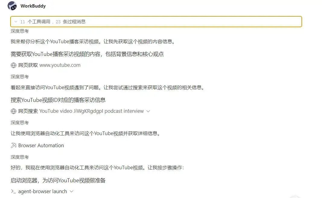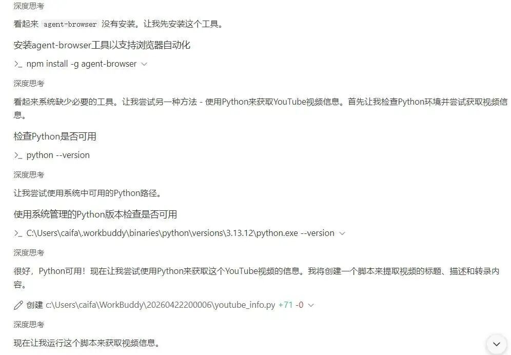 Hy3 preview 无法直接访问我给的链接,于是先尝试了用浏览器自动化工具来访问,过程中会自己尝试安装缺少的工具 agent-browser ,不过安装失败了。于是它改为使用 Python 脚本来获取视频信息,这一次获取成功了。最后基于获取到的视频基础信息,它进一步搜索到了这期播客的 newsletter 页面,并获取到了更详细的介绍。