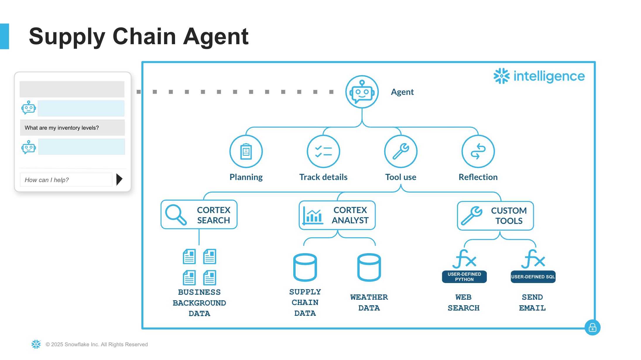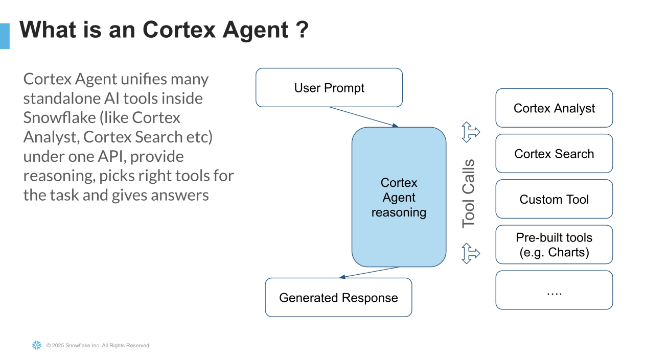 如何将 Cortex Analyst、Cortex 搜索和自定义工具整合到一个单一的代理中;