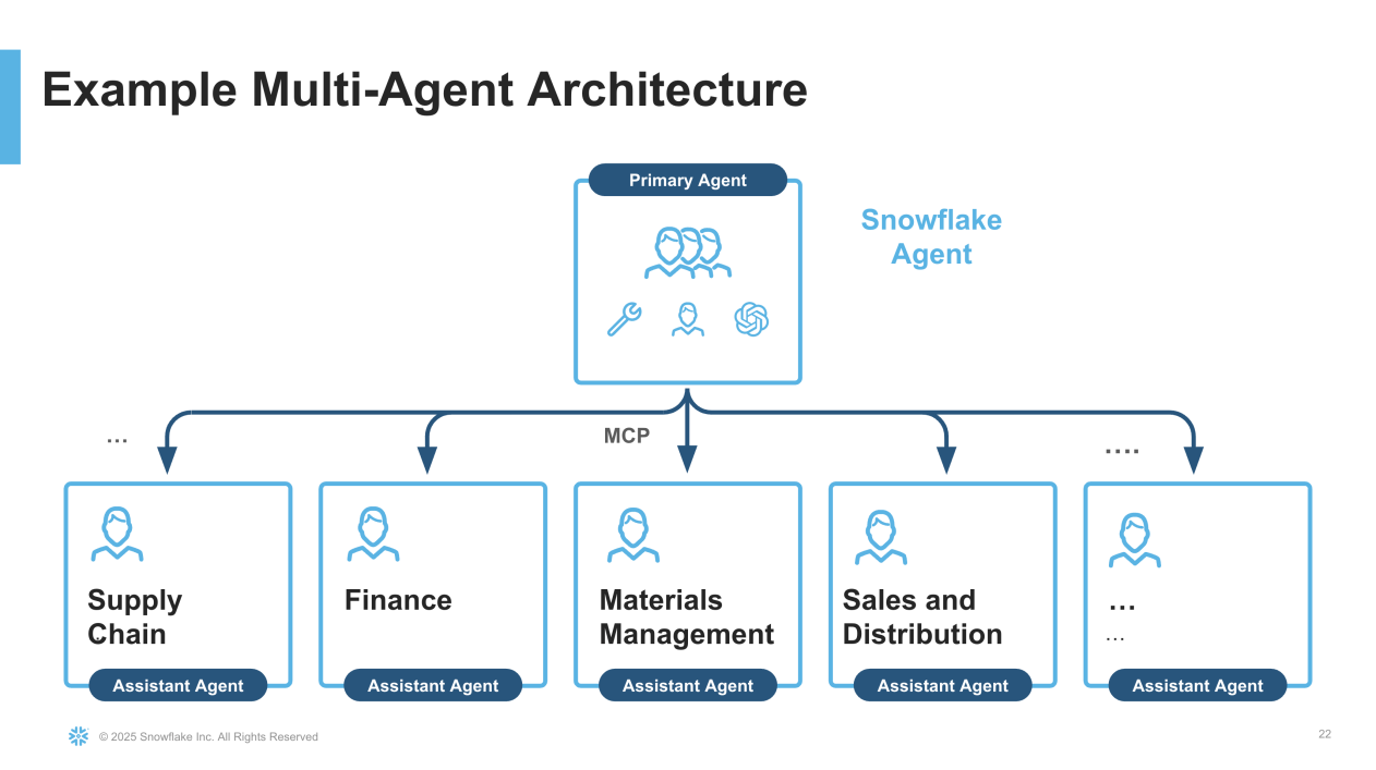 随着组织需求的增长,你可以从单一智能体配合多个工具的模式,演进到由主协调智能体与专业化领域智能体协同工作的多智能体架构。这种架构能实现更好的可扩展性、更深的领域专业性,并支持针对不同业务职能的智能体独立开发: