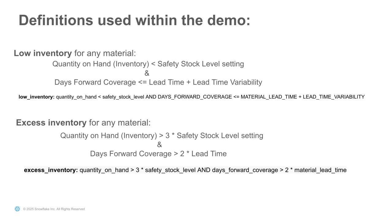 您创建的语义模型定义会自动转化为支撑自然语言查询的 SQL 代码。例如,在语义模型中定义“低库存”和“过剩库存”等业务概念,即可生成精准的 SQL WHERE 子句: