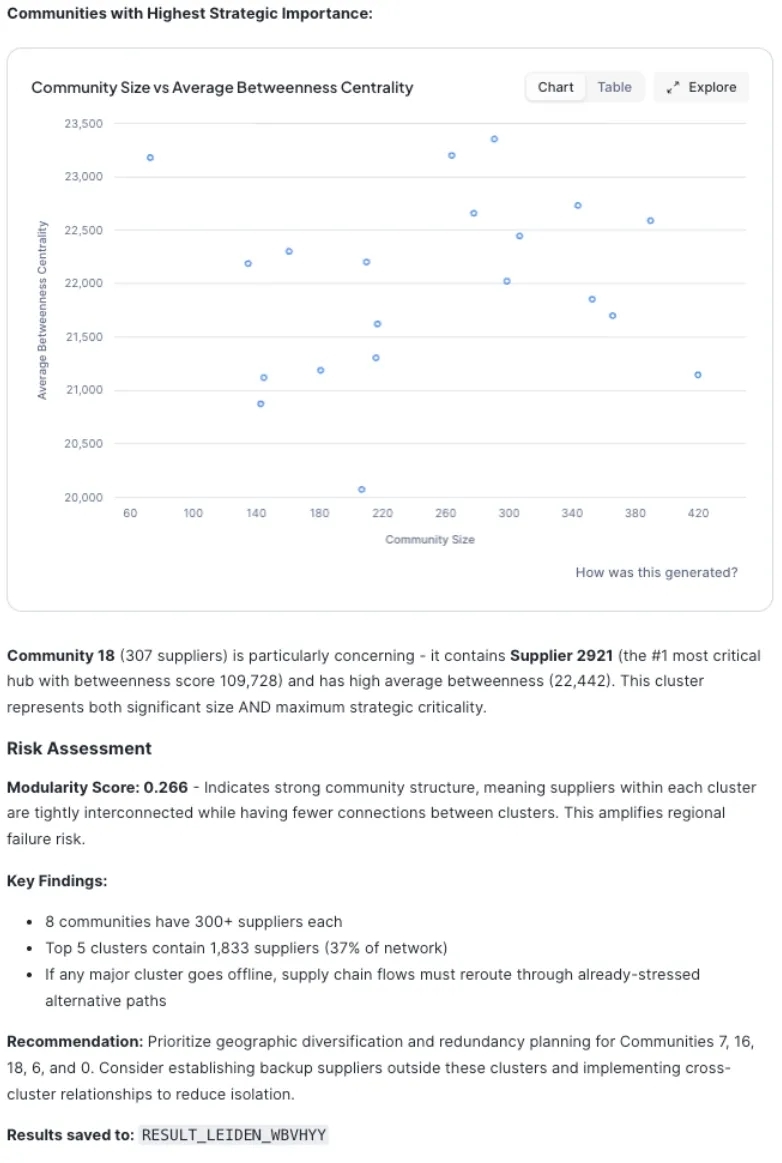 莱顿算法(Leiden)用于集群风险分析:通过莱顿社区发现算法,智能体根据连接密度(如地理区域或共享次级供应商)对供应商进行分组。这使得智能体能够模拟系统性风险:“若自然灾害袭击‘东南亚电子元件集群’,我们多大比例的生产会陷入瘫痪?”