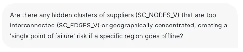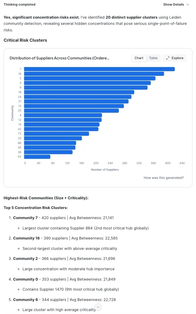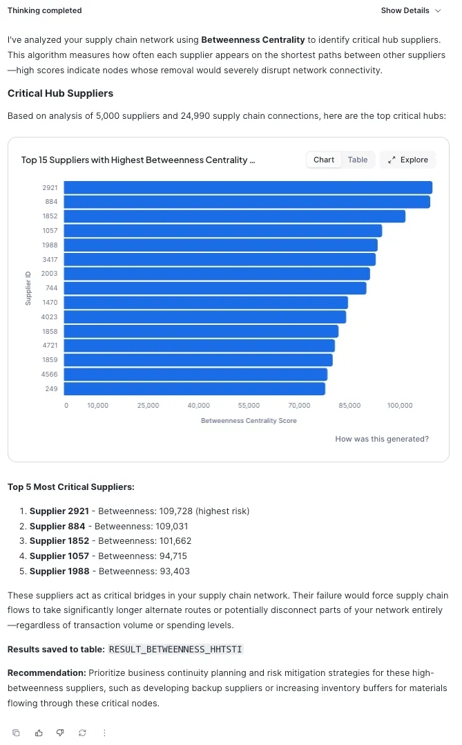 介数中心性(Betweenness Centrality)用于瓶颈检测:该智能体运用介数中心性来识别在多个其他节点间最短路径上充当“桥梁”的供应商或物流枢纽。高分值节点意味着关键瓶颈点;若此类节点失效,网络将面临断裂风险。智能体会向采购团队标记这些隐藏的薄弱环节。