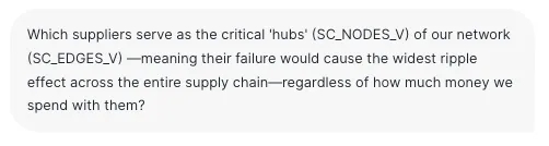 面临挑战:现代工业供应链并非线性链条,而是密集、相互交织的网络。一个看似微小的“三级”部件(例如,特定型号的 O 形密封圈)的延误,就可能导致多家“一级”工厂的生产停滞。传统商业智能工具仅能处理行与列的数据(如供应商 A、供应商 B),却无法识别结构性依赖关系,即整个网络可能依赖于某个单一节点,而该节点仅从采购金额看并不显著。