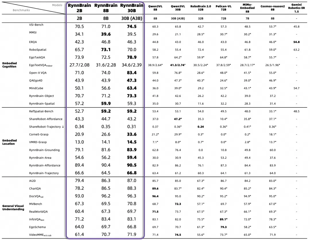 通过完备的实验,RynnBrain 在 16 项具身任务 Benchmark 上全面超越了 Cosmos Reason 2 和 Gemini Robotics ER 1.5 等强大模型实现了 SOTA,并且在 8 项域外 Benchmark 上验证了超越其他具身基础模型的通用泛化性。特别的,我们开源了业界首个 MOE 具身基础模型 RynnBrain-30B-A3B,其只需要 3B 的推理激活参数就全面超越了当前规模最大的具身基础模型 Palican-VL-72B。使用我们的 MOE 模型可以让机器人在保持最强大感知和规划能力的基础上拥有更加快速的动作响应和更加丝滑的行为模式。