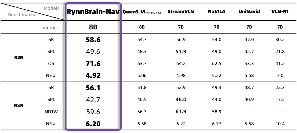 (3)良好的可拓展性:我们在 RynnBrain 基础模型上微调了视觉语言导航和精准操作规划模型,效果轻松实现 SOTA。