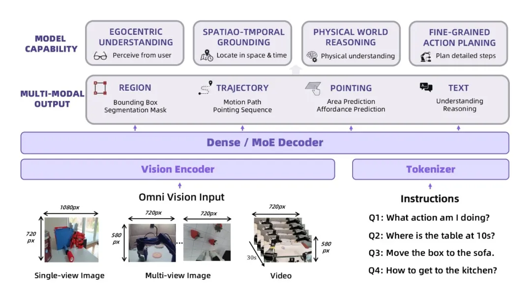 为培养时空记忆,我们将图像与视频视为统一的输入模态。这样,RynnBrain 能够在视频序列中学习时间因果关系与轨迹动态,这对于理解运动与事件至关重要。