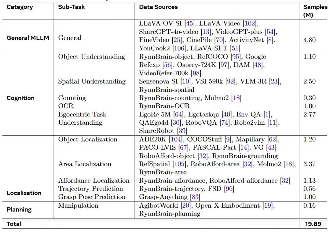 我们为 RynnBrain 的预训练准备了两千万的数据对,具体数据细节如下: