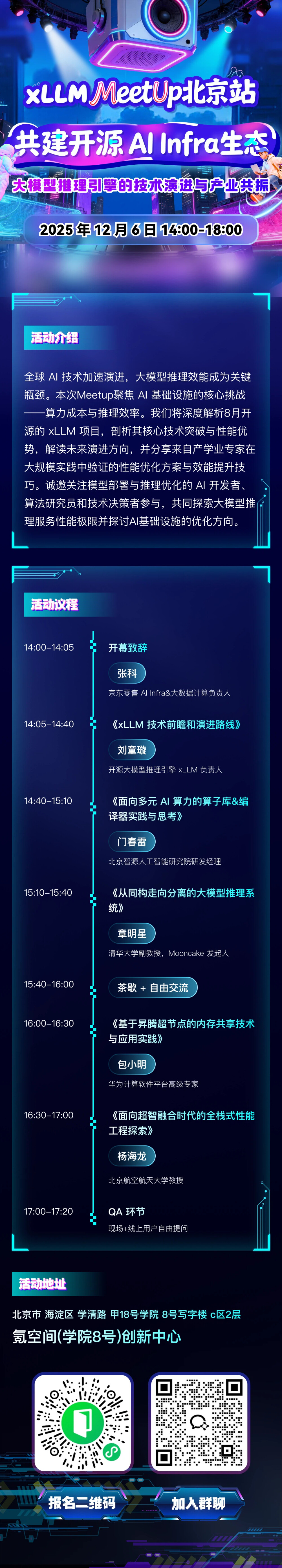 成立三个月的 xLLM 社区,计划于 12 月 6 日在北京氪空间(学院 8 号)创新中心举办以“共建开源 AI Infra 生态”为主题的线下 Meetup。本次活动将首次对外介绍 xLLM 社区,并系统分享其在技术愿景、核心规划、阶段进展以及社区生态方面的实践与思考,希望为业界提供大模型推理引擎的一种可行路径。
