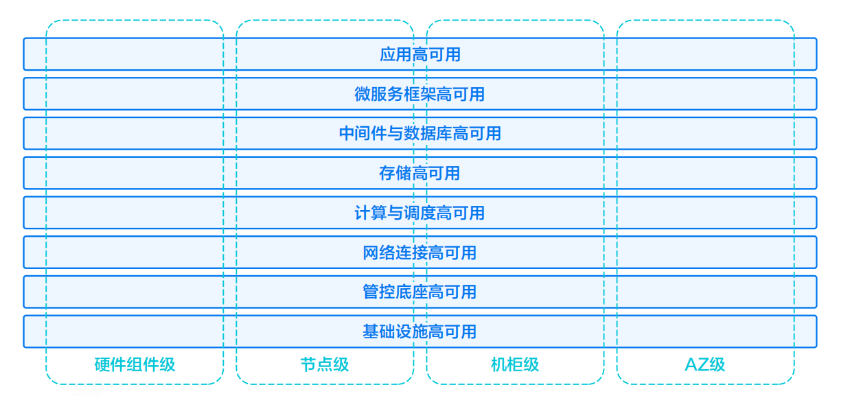 “四纵”的划分本质在于解答故障域问题,也是对高可用问题比较坦诚的回应。行业中,经常有厂商承诺“4 个 9”,但没说清是应对单机故障,还是应对 AZ 级故障。不先定四纵层级,SLA 承诺就没有可参考性。