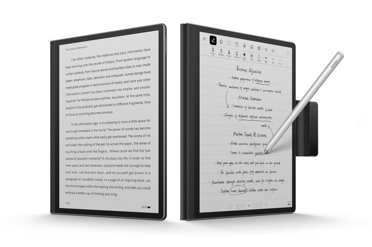 MatePad Paper 搭载 HarmonyOS 2 系统,主打沉浸式阅读、轻办公体验。其机身重量为 360g,提供 4GB RAM 和 64GB 存储容量,采用 10.3 英寸墨水全面屏,屏占比高达 86.3%。它能以 256 级灰阶显示文字、图片甚至影片,同时有 26ms 的响应时间,并支援 32 级背光。结合华为自研的墨水屏显示增强算法,官方宣称能带来真实自然的“纸感”体验。搭配第二代 M-Pencil 手写笔,系统支持手写、录音、手写转文本多种记录方式,同时拥有分屏笔记和全局批注能力。