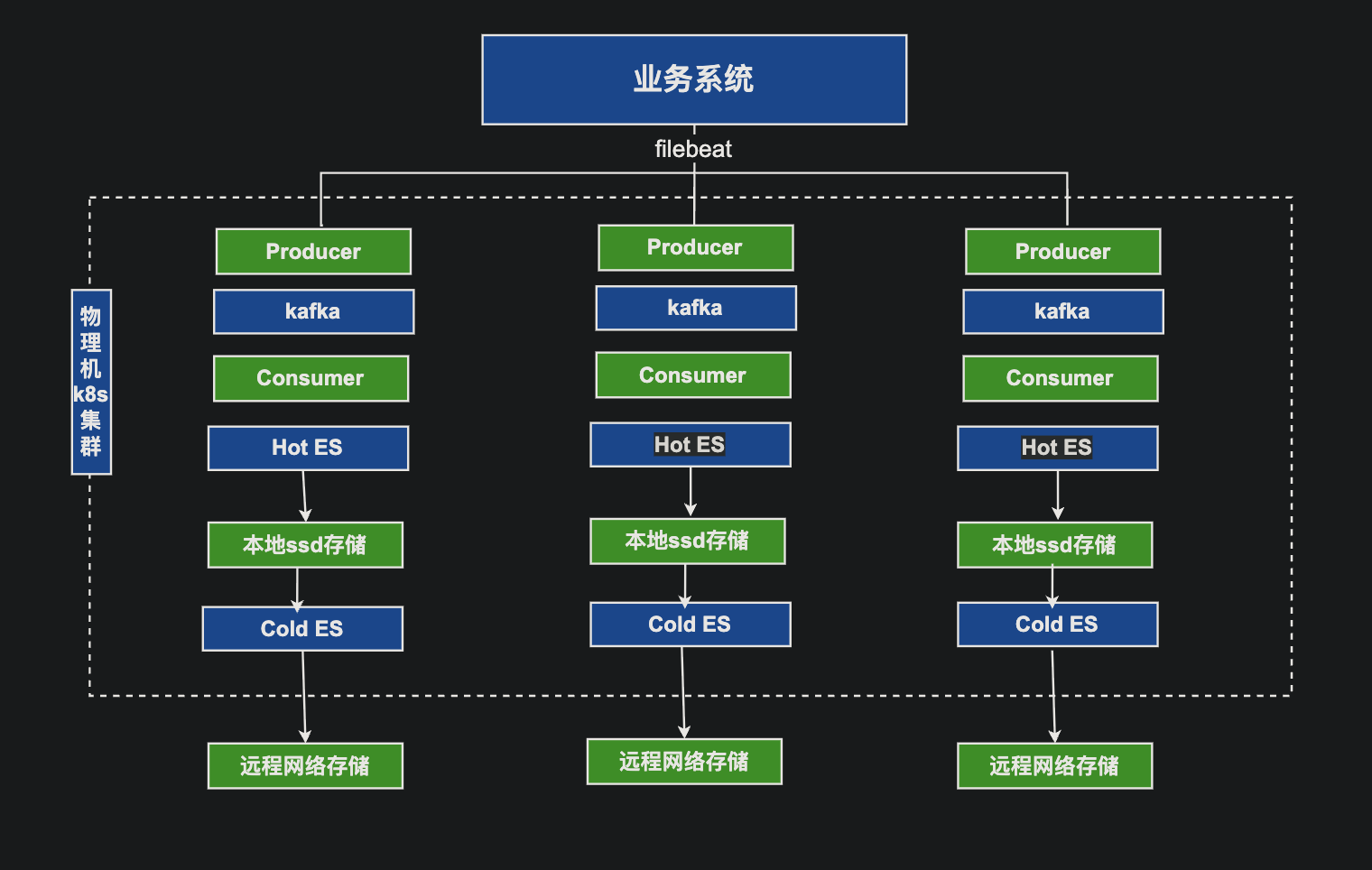 b、但是新集群仍然面临写入远程带宽受限的问题,所以团队经过技术评估,决定新的 ES 集群使用本地盘+远程存储的方式,即在新集群中 hot 节点数据使用本地盘,数据保留时间为 7 天,cold 节点使用远程存储的方式,数据为 7 天之后 hot 节点迁移过来的数量,继续保存 23 天,以解决远程存储带宽受限及 ES 写入性能不足的问题,新集群的所有组件均在 k8s 平台基于容器化部署的方式交付,本地盘通过 local storage 的方式挂载给到 ES 的 pod 使用。