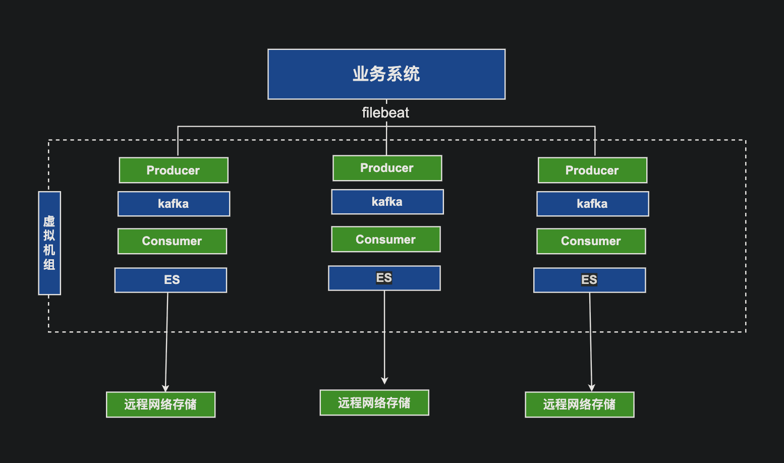 自 2024 年以来,日志平台团队开始逐步接手相关的平台建设工作,从日志采集组件(filebeat),日志接收(logstash producer), kafka ,日志消费组件(logstash consumer), ES 集群,数据存储模式,日志查询组件(kibana),ES 多集群查询组件(CCS)等层面进行了逐个优化,下图为日志集群没有优化之前的架构模式图:
